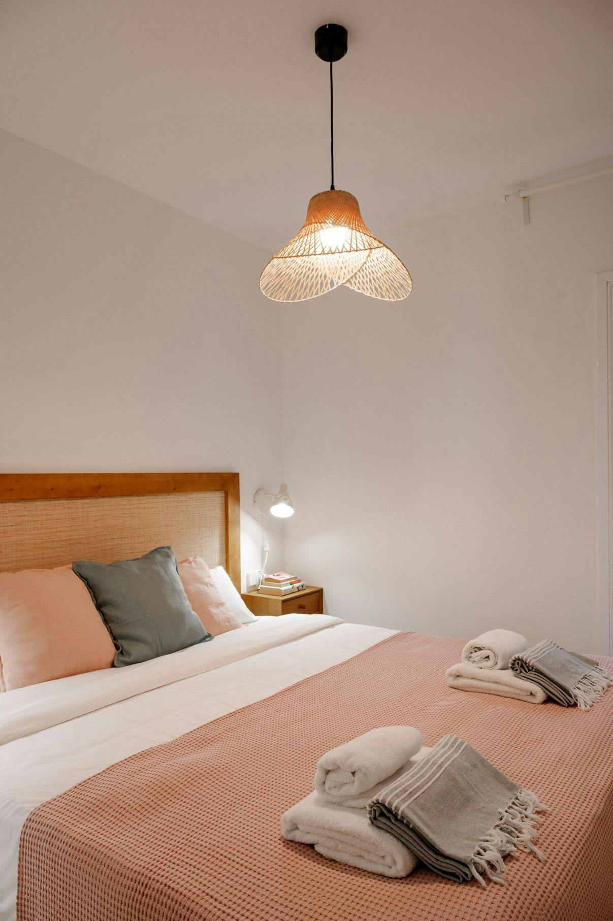 It has 3 bedrooms, 2 full bathrooms, one with a shower and the other with a bathtub, and a fully equipped kitchen. One of the rooms has a double bed, the second room has a single bed and the third room has two single beds.