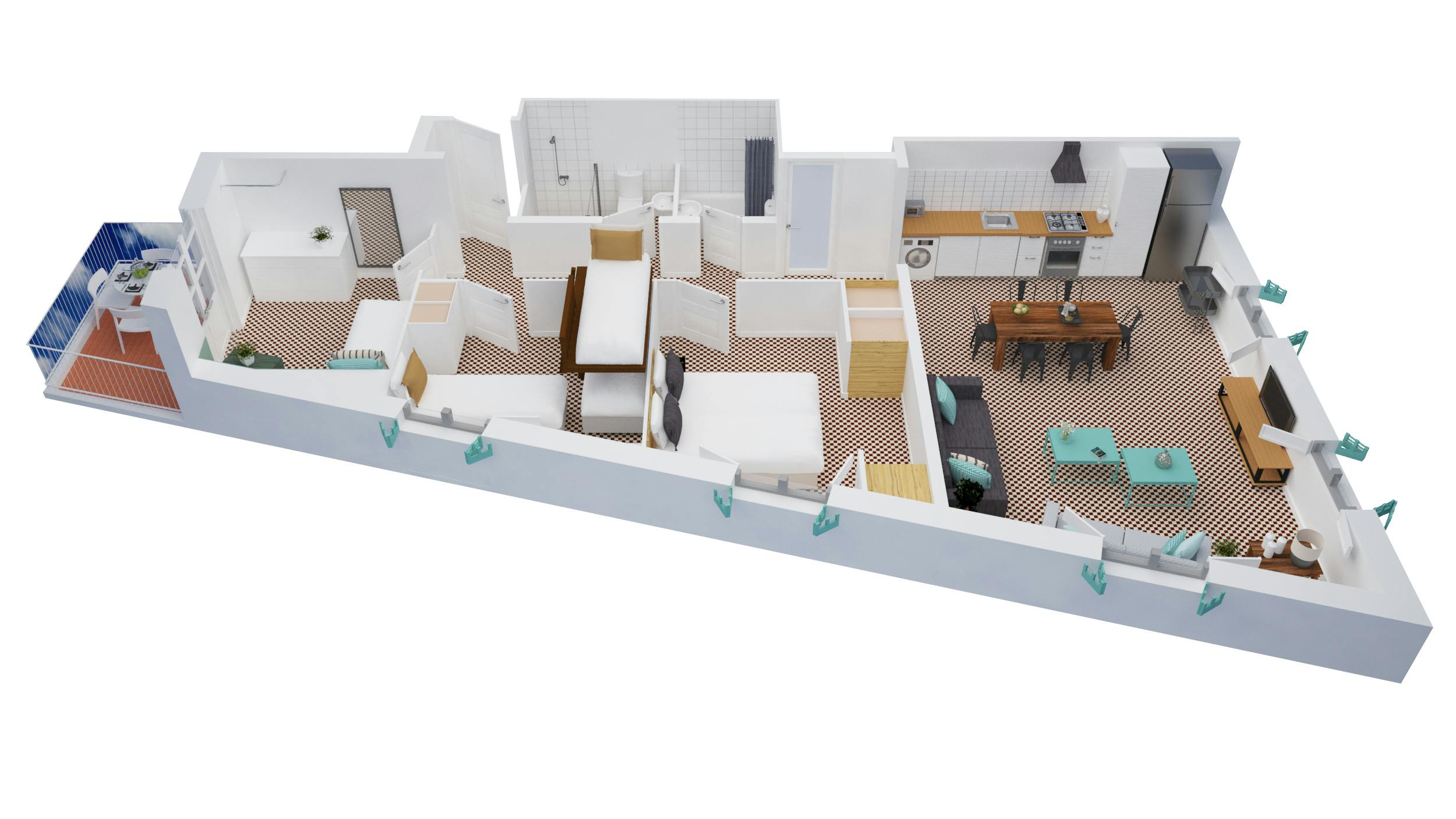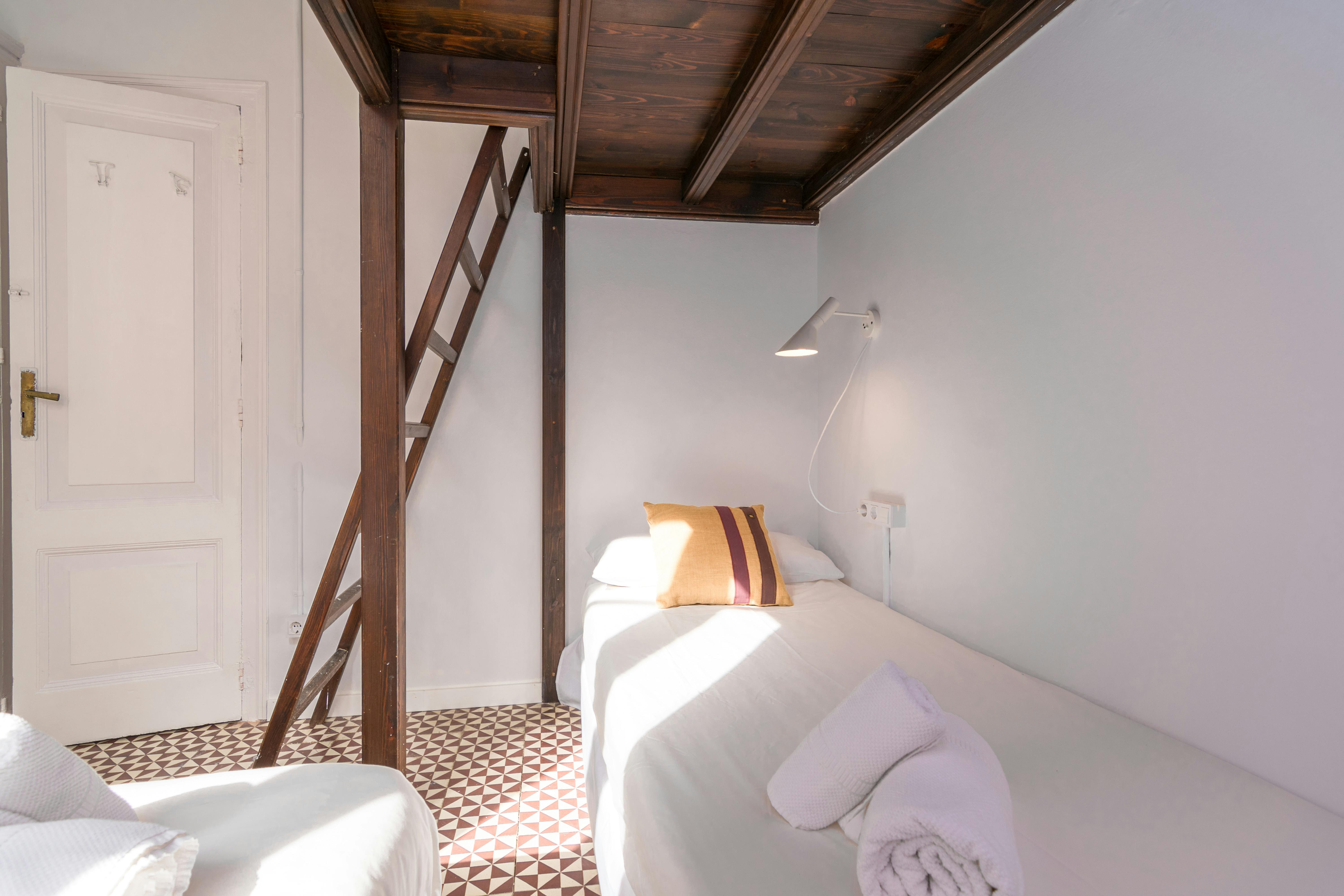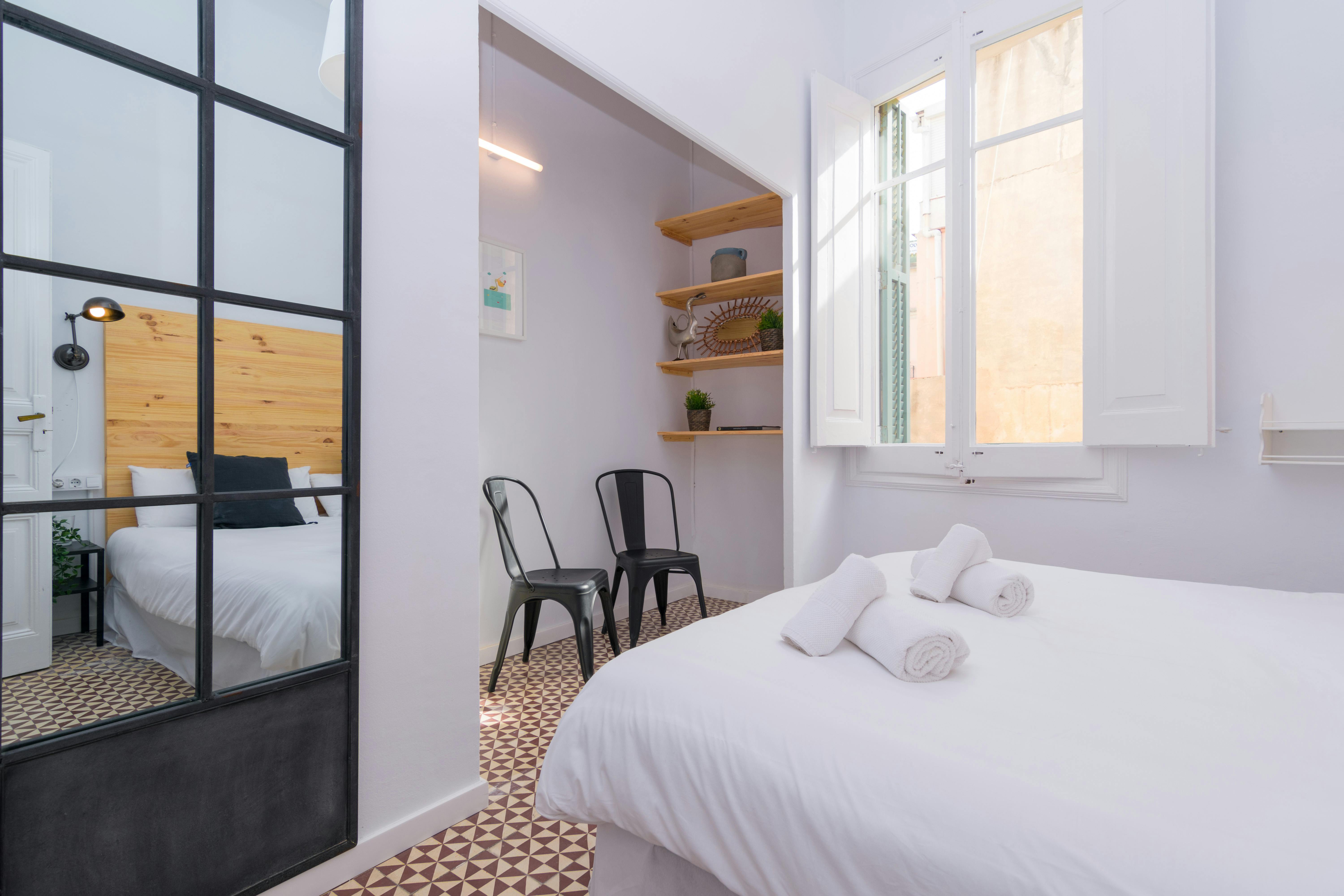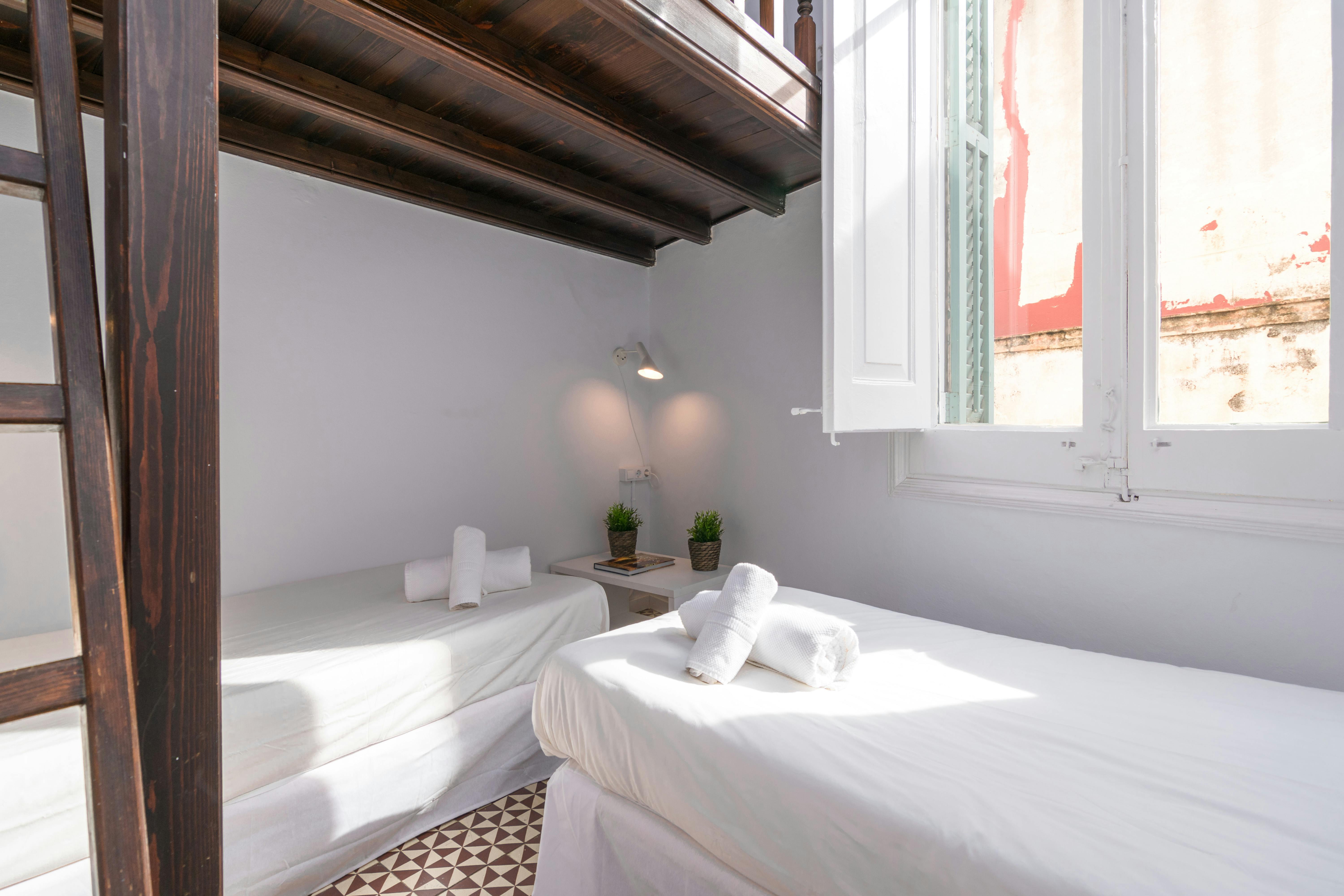 It has 3 bedrooms and 2 bathrooms. A double room, a single room, and a room for 3 people with a single bed and some bunk beds. The apartment also has a small terrace at the back of the apartment.
