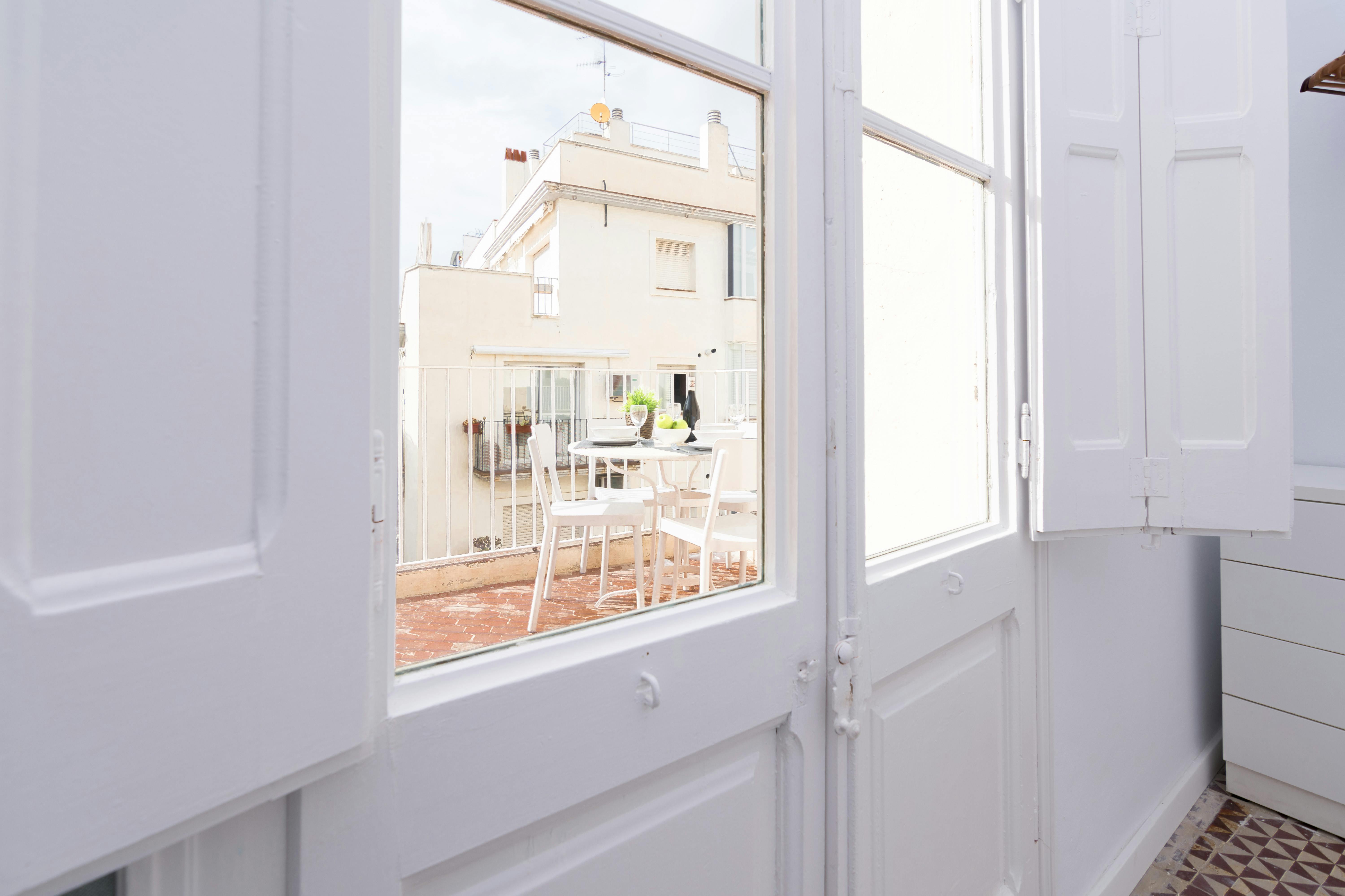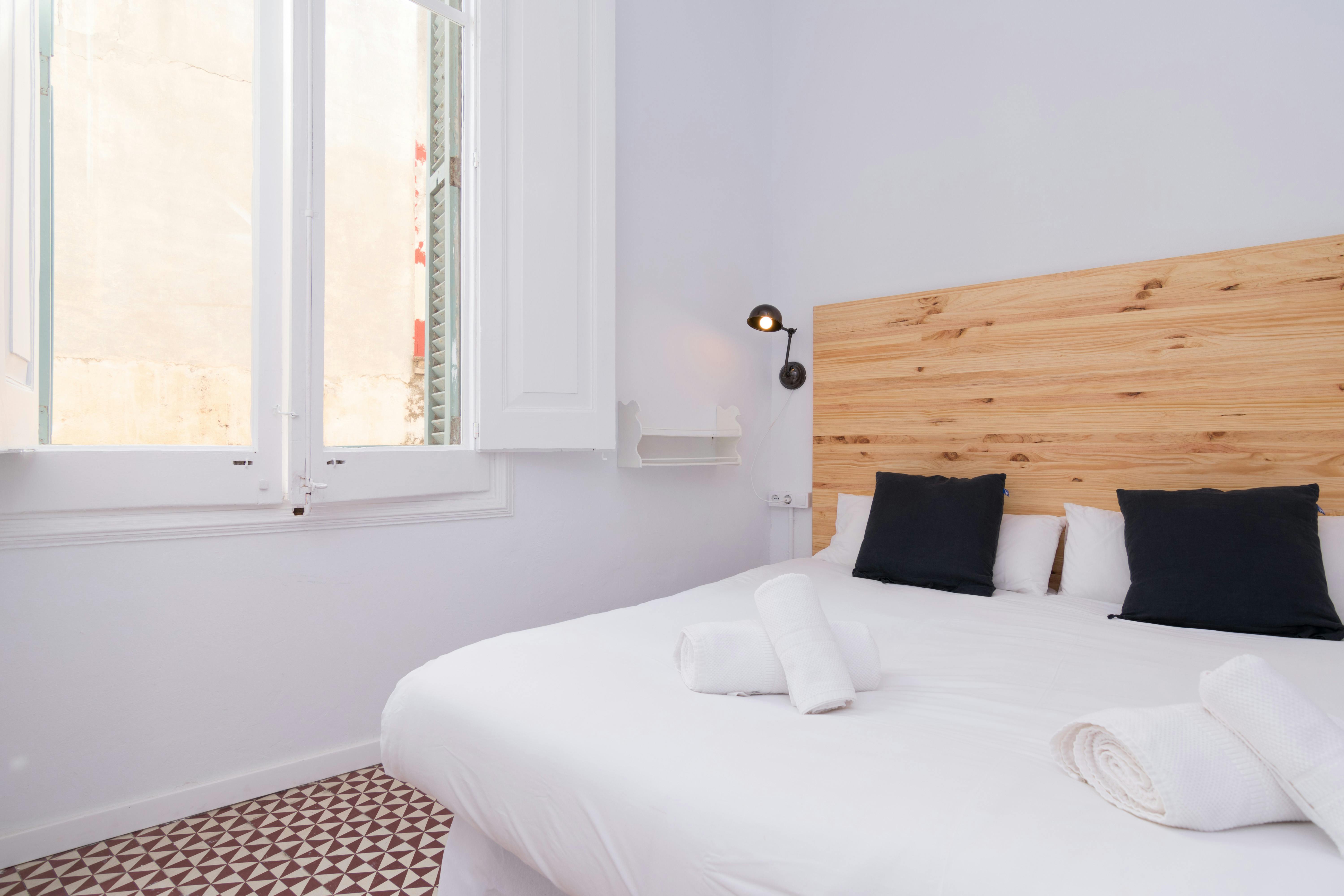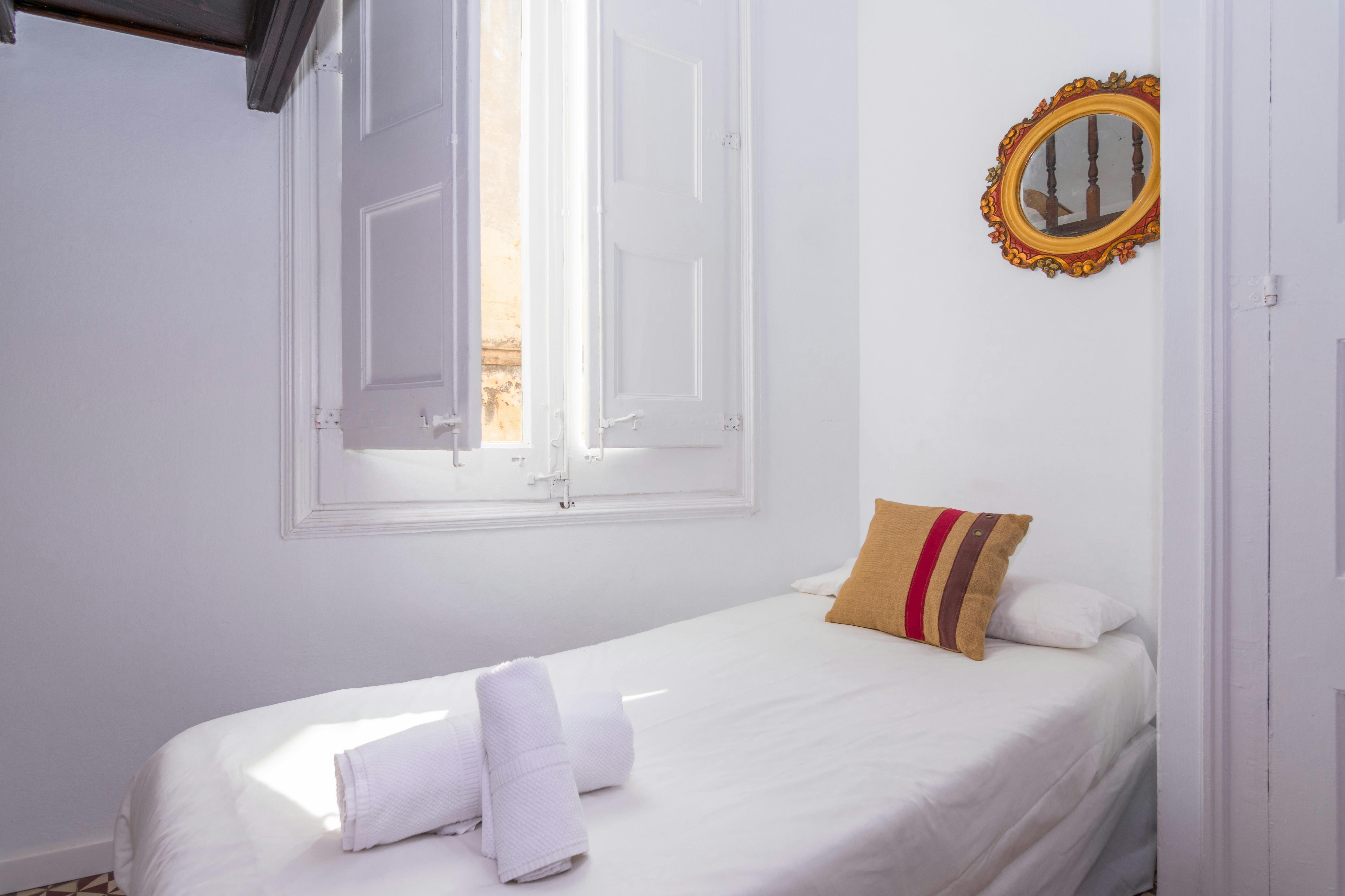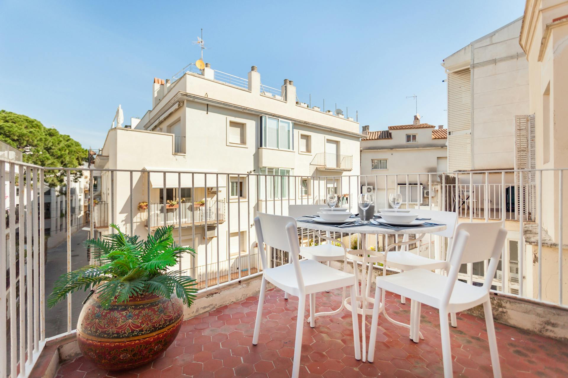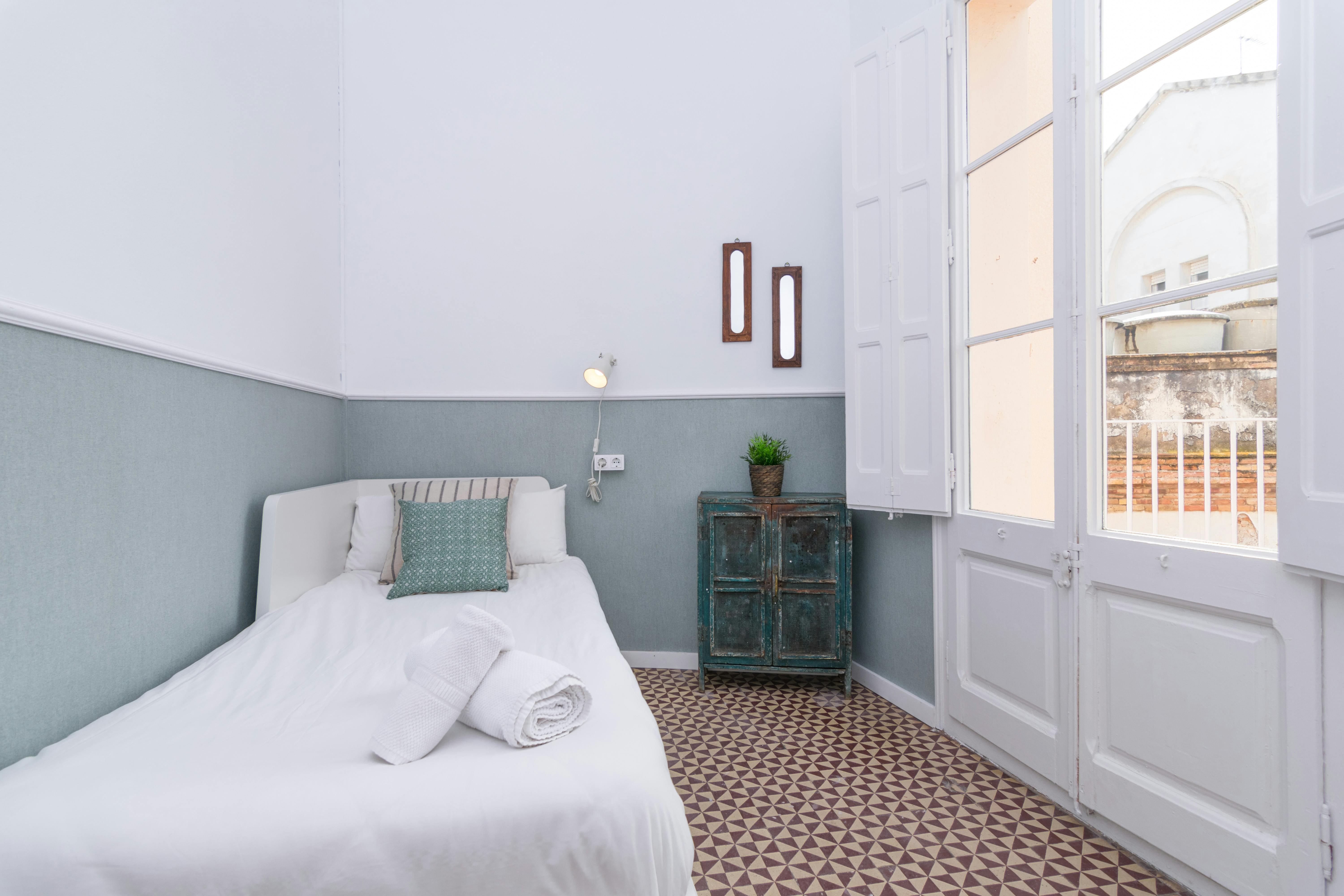 It has 3 bedrooms and 2 bathrooms. A double room, a single room, and a room for 3 people with a single bed and some bunk beds. The apartment also has a small terrace at the back of the apartment.